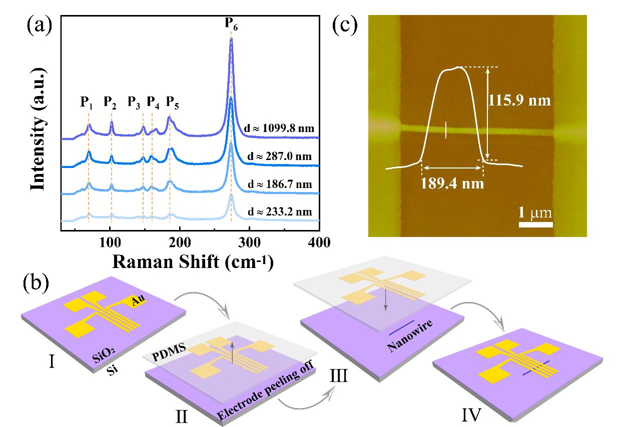 图2. (TaSe4)2I的拉曼表征及光电探测器的制备