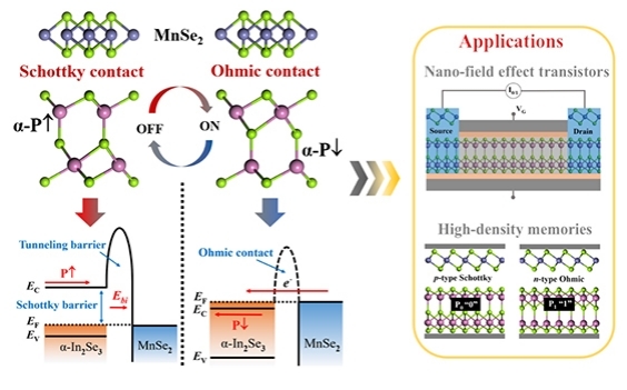 该课题组基于密度泛函理论的第一性原理计算方法,构建了α-In2Se3基多铁异质结,利用铁电极化方向反转非易失性调控α-In2Se3/MX2(MX2:1T-MnSe2,1T-VSe2,1T-VTe2和1T-CrTe2)异质结界面从p型肖特基到n型欧姆接触的转变,发现这种转变不受层间距以及应变的影响。该研究从肖特基势垒和隧道势垒两个方面深入分析了肖特基接触到欧姆接触转变的物理机理,为克服FLP效应以及接近Schottky−Mott极限提供理论基础。