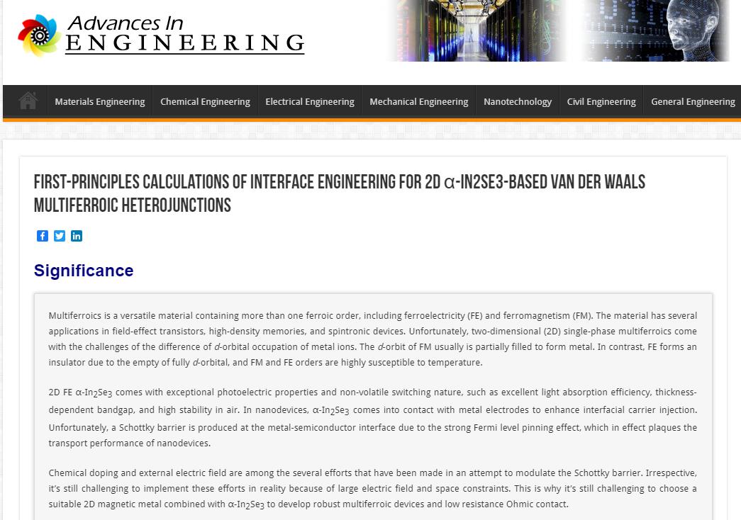 近日,欧阳钢教授课题组在Applied Surface Science上发表的论文“First-principles calculations of interface engineering for 2Dα-In2Se3-based van der Waals multiferroic heterojunctions”被国际著名工程学网站“Advances in Engineering”(简称AIE)评选为应用物理学领域关键性科学文章,并进行专题报道。