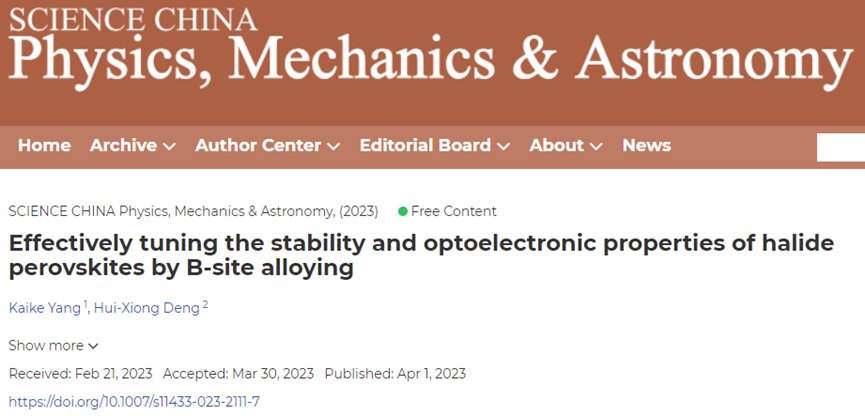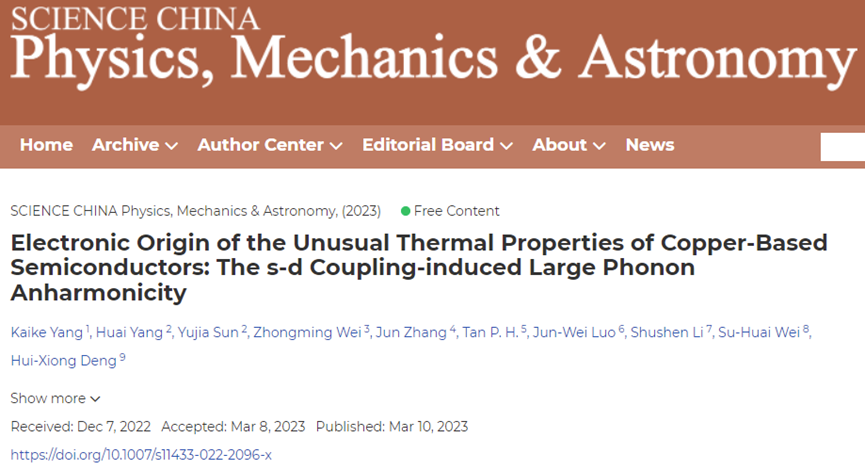 半导体材料是现代光电和微电子信息技术的基础。后摩尔时代半导体器件尺寸不断缩小和集成电路晶体管数目成倍增加,有效地热耗散和热控制成为微处理器、光伏、热电等设备高效率稳定工作的重要保障。如何调控半导体材料热导率和增强热力学稳定性是需要解决的一个关键科学技术问题。近日,澳门新新浦京708杨凯科教授与中国科学院半导体研究所邓惠雄等人在SCIENCE CHINA Physics, Mechanics & Astronomy上发表题为“Electronic Origin of the Unusual Thermal Properties of Copper-Based Semiconductors: The s-d Coupling-induced Large Phonon Anharmonicity”和“Effectively tuning the stability and optoelectronic properties of halide perovskites by B-site alloying”的两项研究成果。