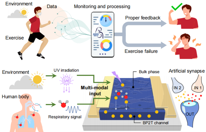 在该工作中,团队开发了一种基于双相BP2T有机半导体薄膜的仿生突触晶体管,实现了对人体呼吸和环境紫外线的同步响应,以及多模态数据的高效处理。该器件利用BP2T薄膜的特殊结构,将呼出气体中的水分子吸附转化为突触电流,实时检测呼吸频率;同时利用其光敏特性检测环境紫外辐射。并构筑了实时反馈神经形态系统,能够对人体生理信号和外部环境信号进行动态监测与即时反馈,为医疗健康与个性化信息服务领域提供了节能且智能化的交互界面,也为未来发展更复杂、自适应、多阈值的智能感知系统奠定了基础。