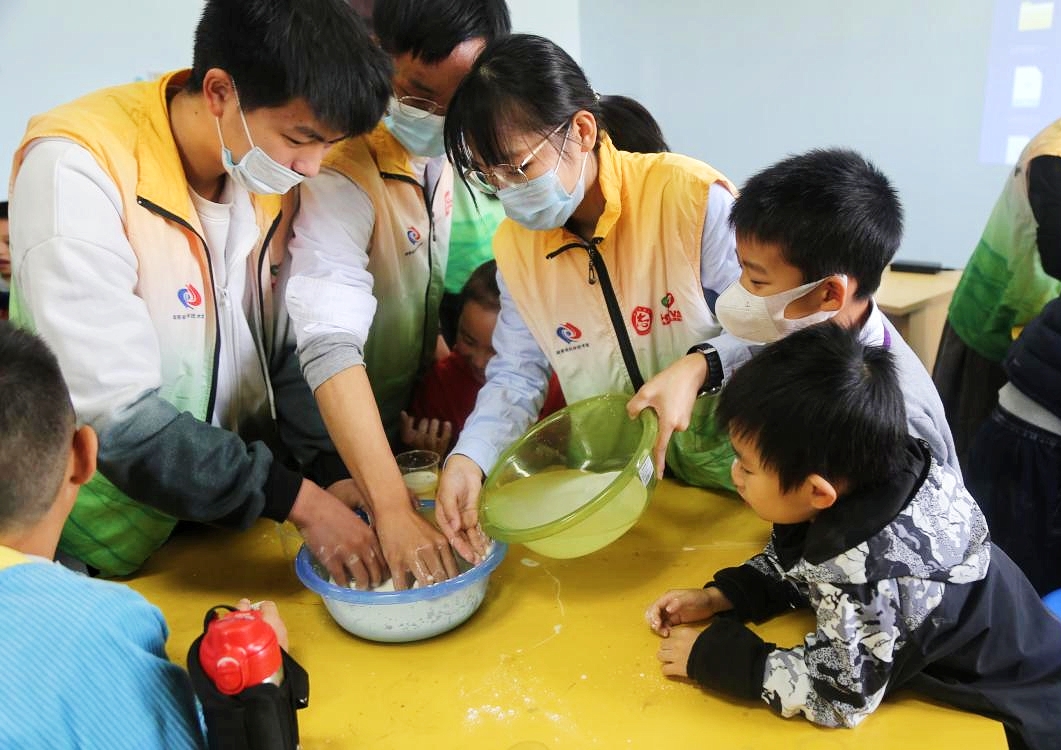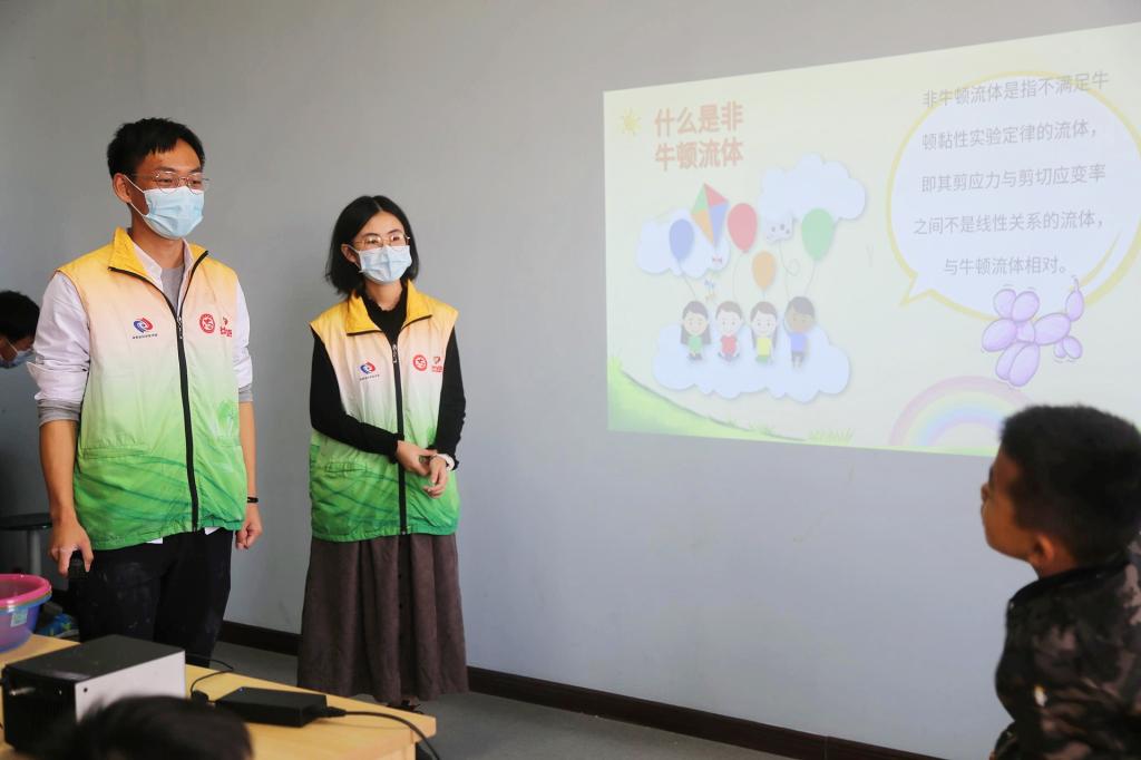 志愿者们先简要介绍自己,将现场气氛带动起来。然后他们为孩子们讲解关于“非牛顿液体”和“虹吸”的知识点并播放实验操作视频。孩子们在认真学习理论知识后积极参与到实验操作过程中去,简单的实验让孩子们玩得不亦乐乎,部分孩子的实验取得成功。随后志愿者挑选两位小实验能手进行小比赛,双方不分伯仲。对于一些性格内向的小孩子,志愿者们的细心教导和耐心解答让他们渐渐放开自己,投入进去,体会到动手的乐趣。