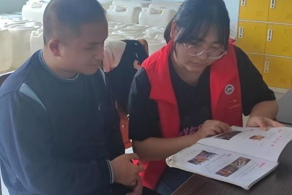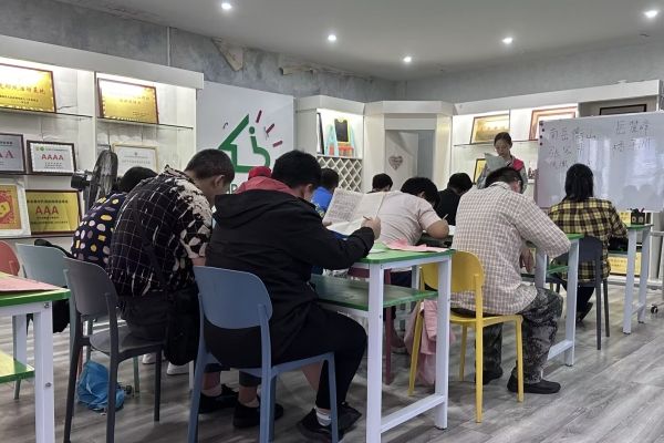 在小队长的组织下,志愿者们提前到达阳光家园,并与社工对接了解活动相关事宜后,志愿者们合理分工,分别采用写字、讲课、谈心的方式照顾社区中心智障碍者。