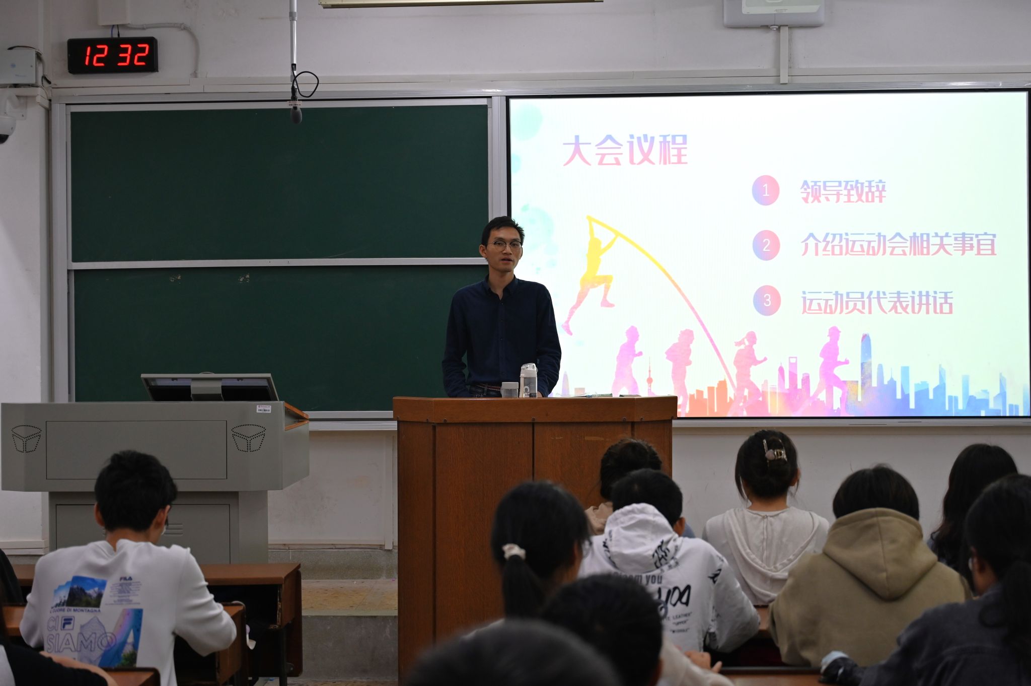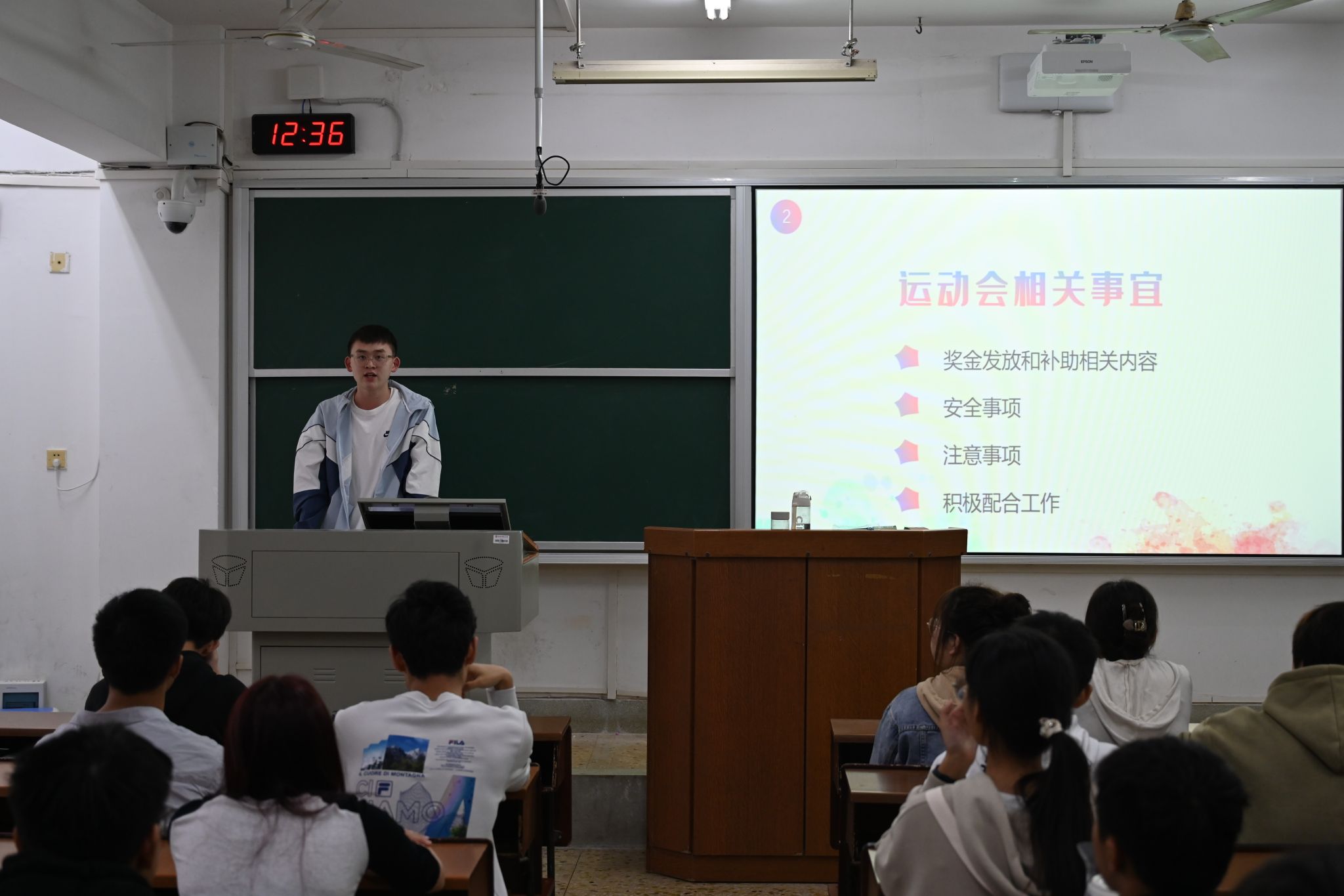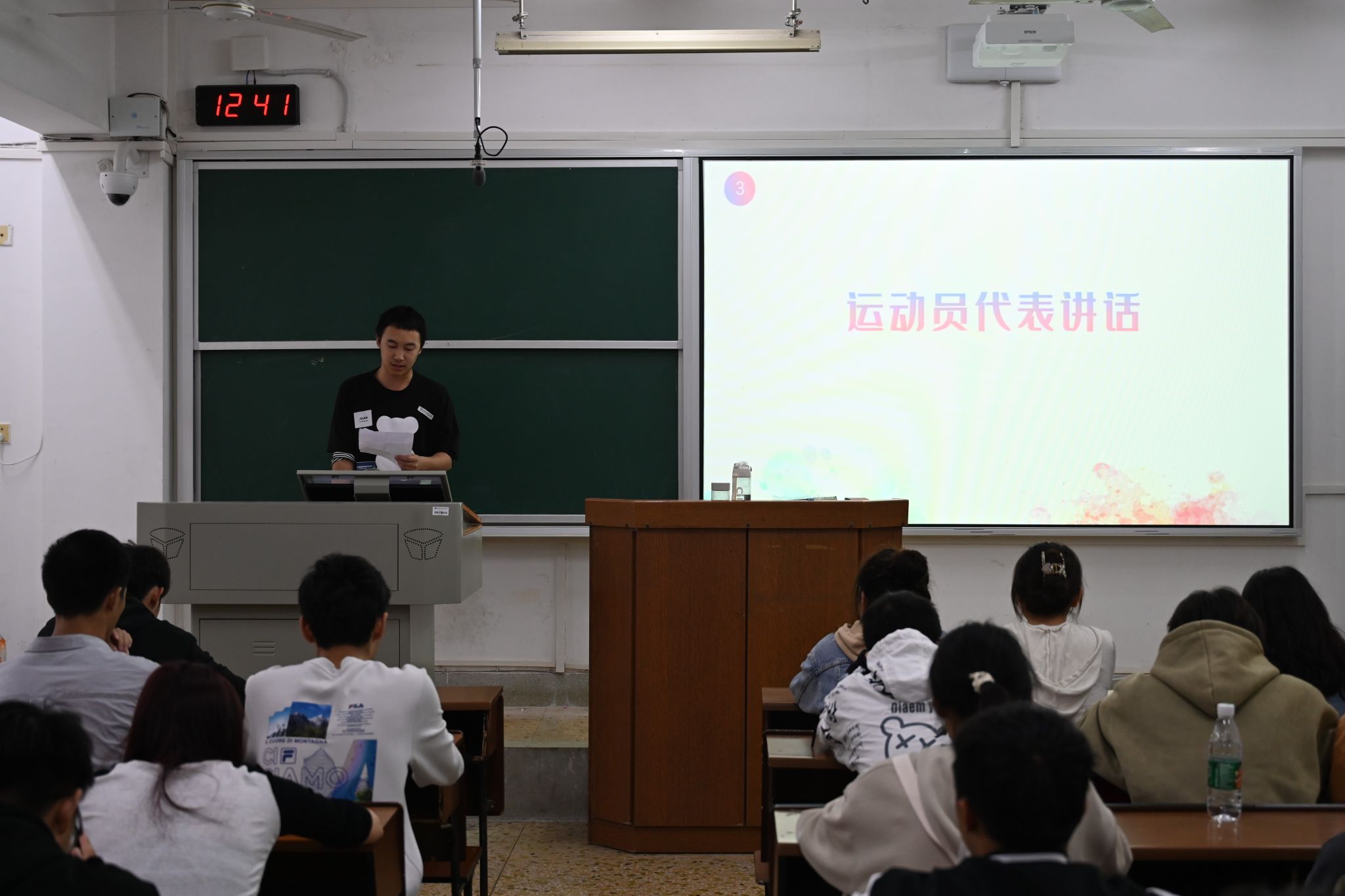 文体部干事廖煦平向参会运动员们介绍了运动会相关事宜及运动会的奖金与补助发放等奖励机制。运动员代表罗杰向运动员们分享过往比赛体验。他认为校运会是澳门新新浦京708学子体现坚强意志的机会,希望运动员们能从运动中感受快乐、勇往直前,为学院争得荣誉。