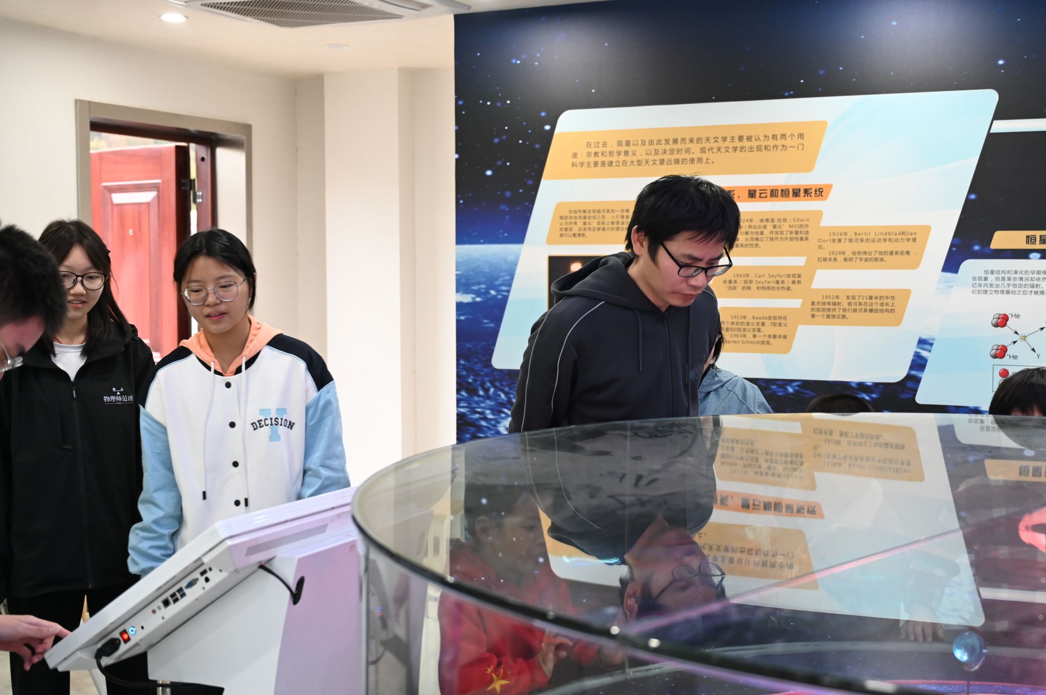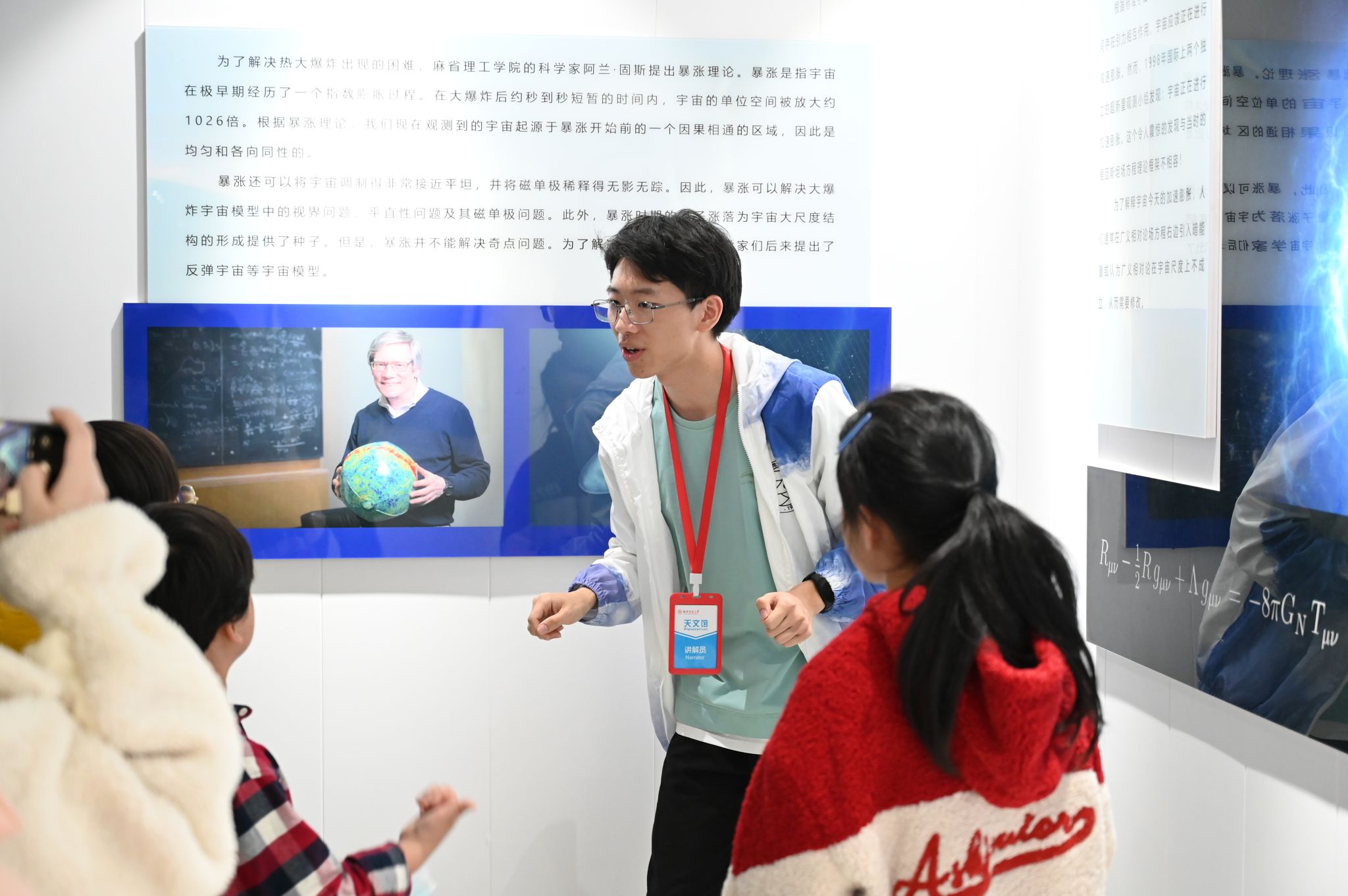 姚睿带领参观者参观澳门新新浦京708天文馆,并介绍了馆内展厅相关天文科普内容与天文馆的内部建设。他从基本的天文知识切入,结合板块内容及天文相关视频,由浅入深地讲解了恒星演化、黑洞形成、太阳系行星运转等天文学知识。为使参观者更深入了解天文学学科,姚睿详细介绍了中国古代天文学发展史,具体说明了天文学对于古代社会生产方面,如纪时、纪年等所起到的重要作用。随着参观过程的推进,参观者们跟随姚睿来到天文馆露台观察专业望远镜和观测相关设备的内部构造,并学习观测原理。