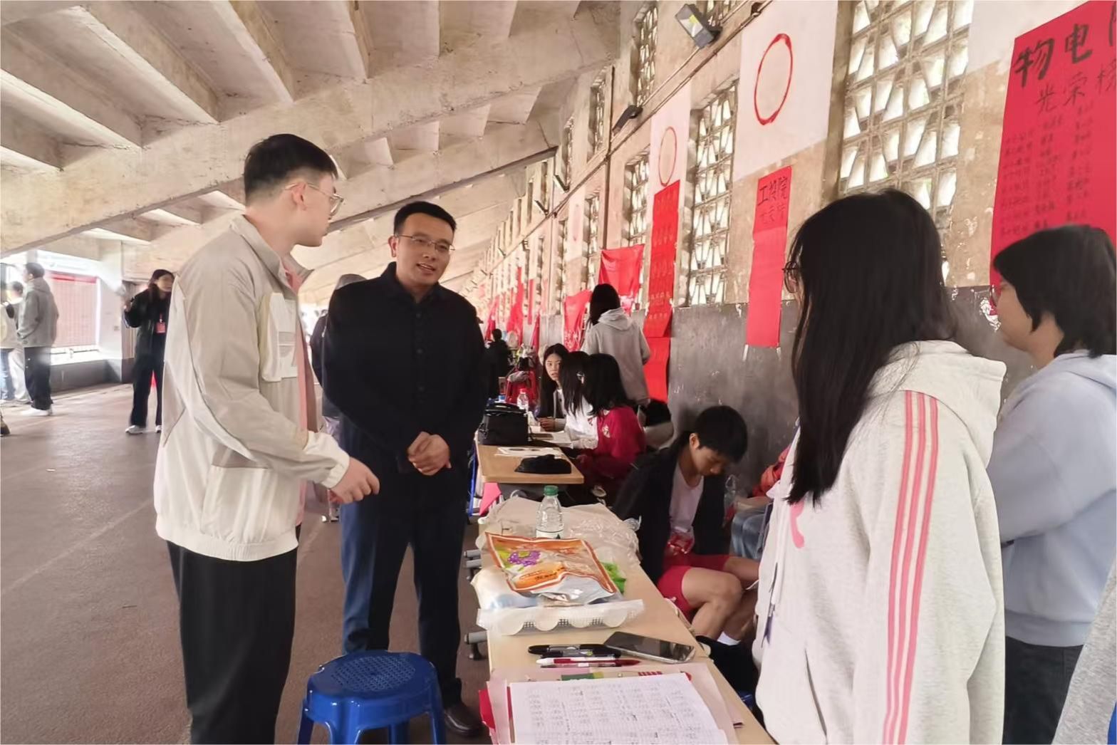 校运会期间,院党委书记罗嵘、党委副书记郭铭伟及学工办辅导员老师亲临赛场,慰问了参赛运动员和后勤志愿者。罗嵘特别提醒志愿者们要密切关注运动员的身体状况,确保赛前赛后的各项服务周到细致,为运动员们提供坚实的保障,彰显物电学子团结互助、追求卓越的精神风貌。郭铭伟副书记对运动员们展现出的奋勇争先精神给予了高度评价,激励大家不仅要赛出个人风采,更要赛出高水平,体现出物电学子勇于超越自我的坚定信念。老师们的亲切慰问极大地鼓舞了运动员和志愿者的士气,使他们更加坚定了为学院赢得荣誉的决心。