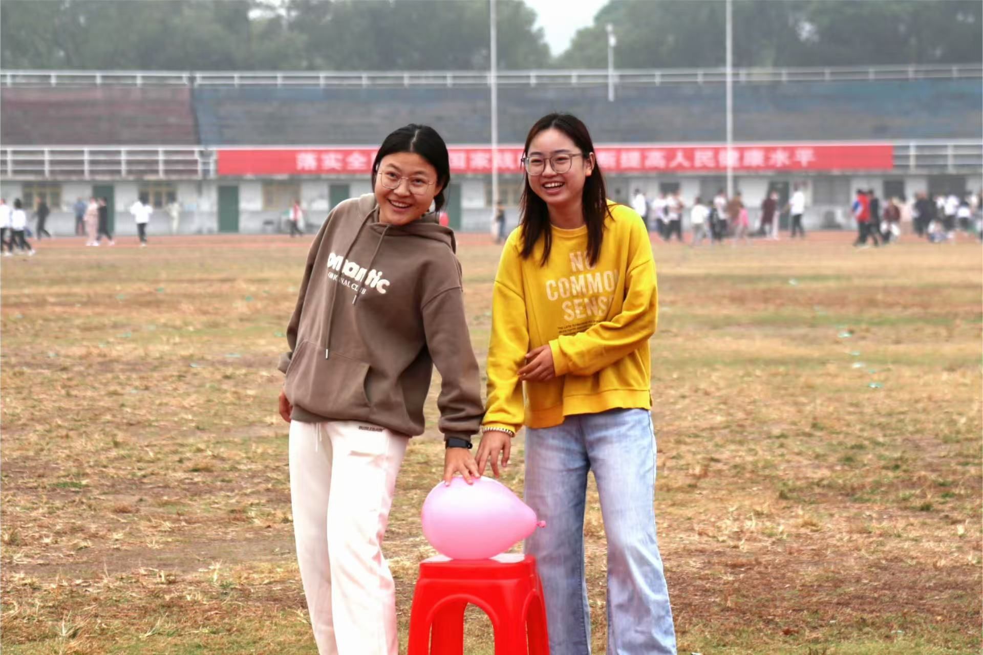 同学们体验背靠背爆气球
