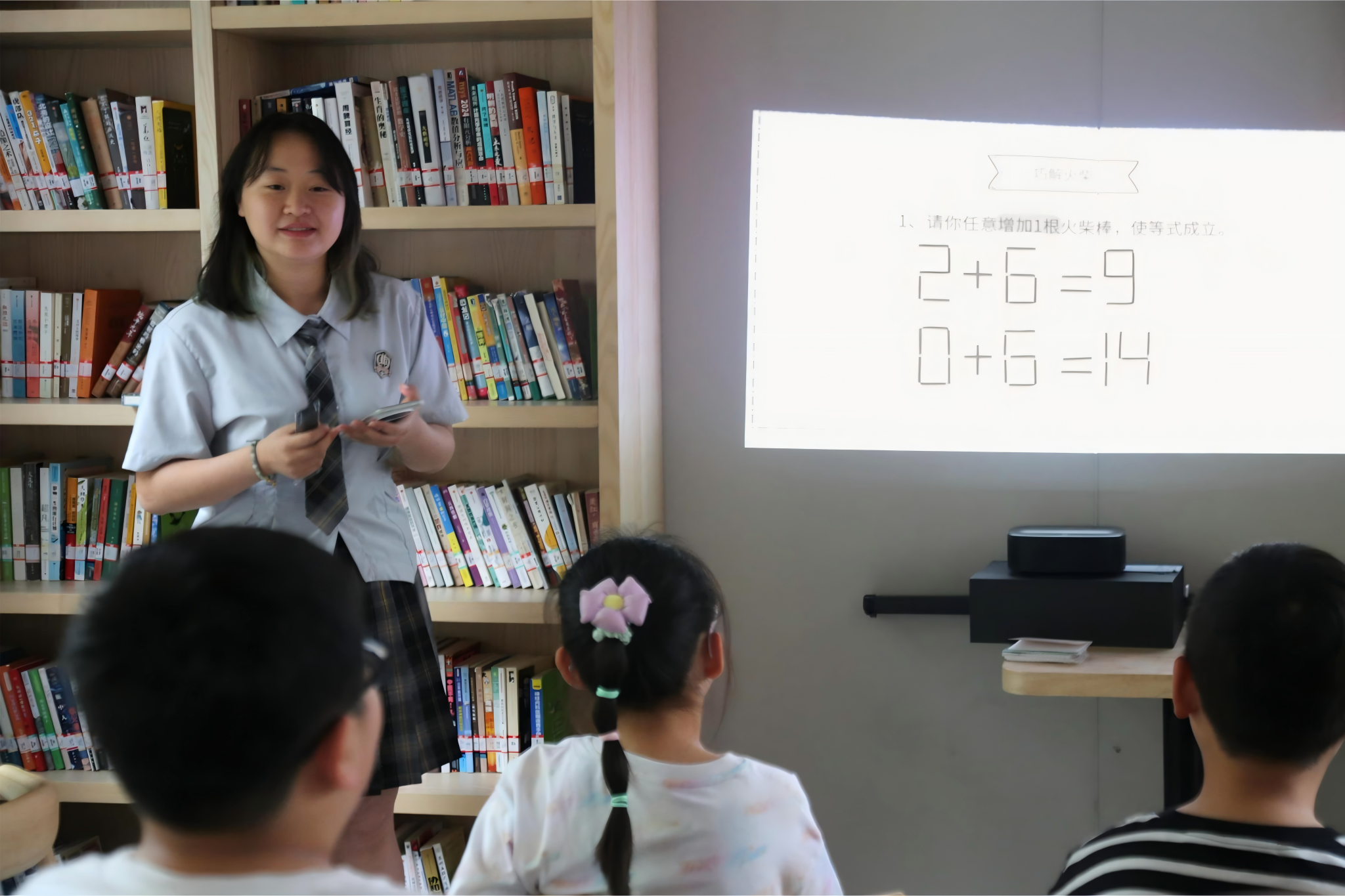 讲师向小朋友们教授简便运算方法与速算技巧,她在授课时注重与小朋友们的互动交流,并鼓励小朋友自主思考、积极回答问题。小朋友们热情高涨,踊跃举手,上台分享自己的解题思路。讲师设置了“巧解火柴”和数独游戏等趣味数学板块,丰富了教学内容,并有效培养了小朋友们的专注力和推理能力。活动过程中,志愿者们协助讲师维持现场秩序,时刻关注小朋友需求,及时给予帮助,引导小朋友们有序参与活动。