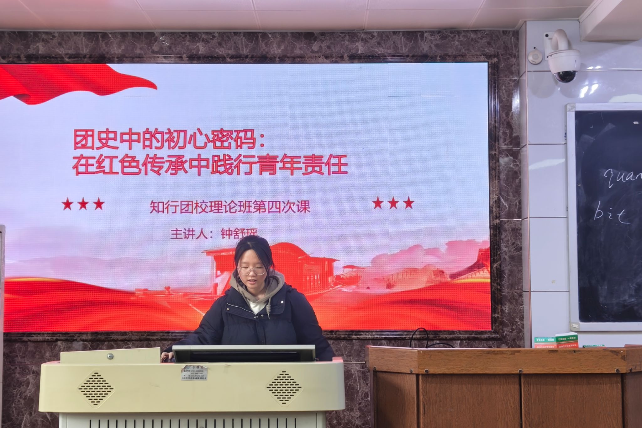 课程后半部分,钟舒瑶围绕“在红色传承中践行青年责任”作总结阐述。她提到,无论处于哪个历史阶段,中国青年始终是国家发展与民族复兴的中坚力量。最后,钟舒瑶引用鲁迅先生“愿中国青年都摆脱冷气,只是向上走”的名言,激励在场学员作为新时代青年,要从团史中汲取精神力量,将个人理想融入国家发展大局,在学习与实践中勇担时代使命,让红色基因在青春奋斗中代代相传。