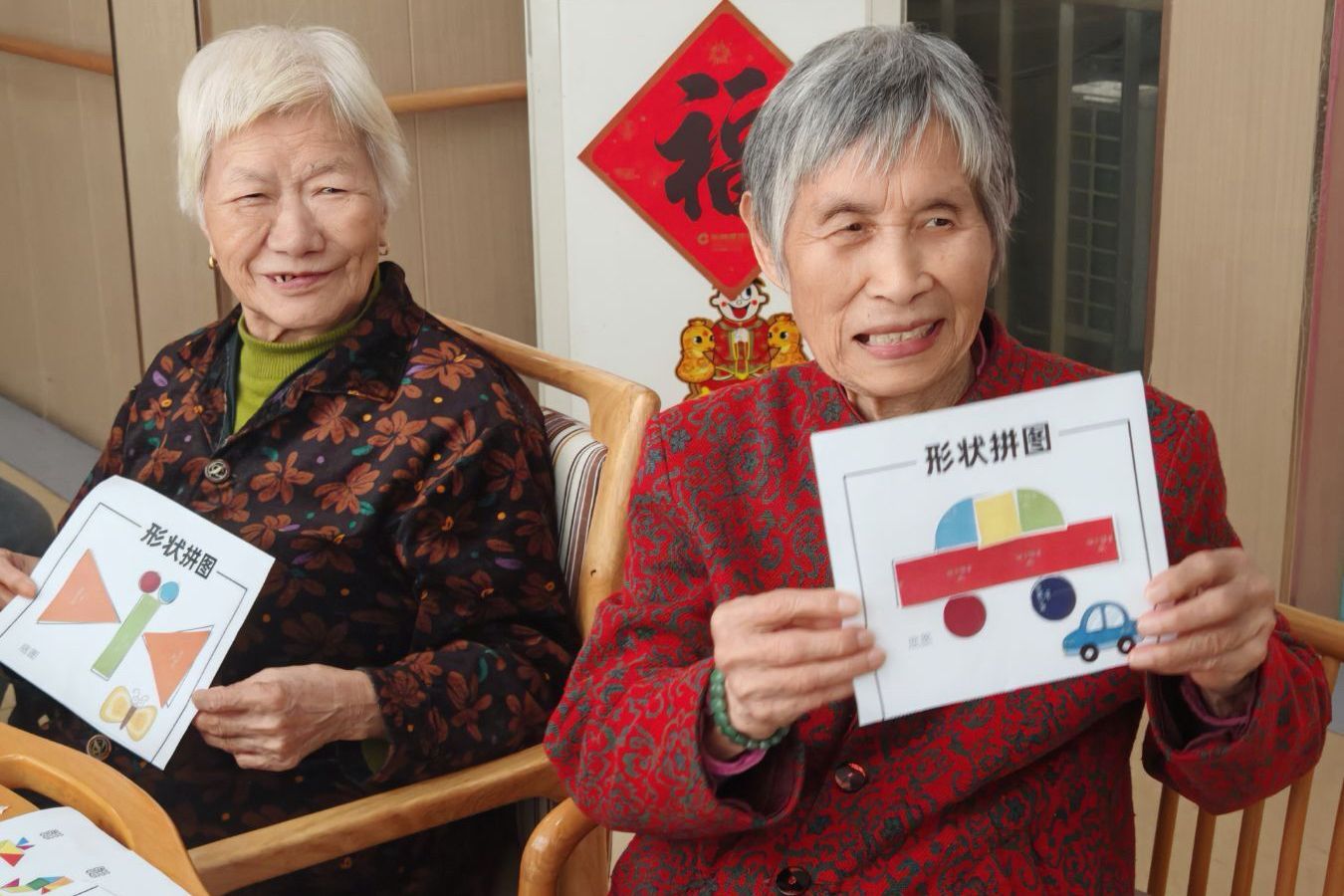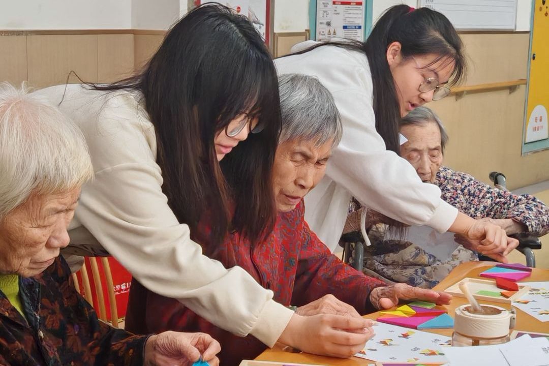 志愿者协助老人拼图