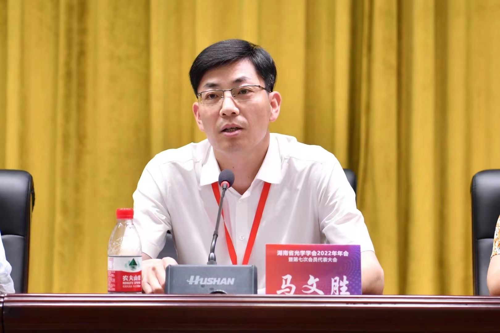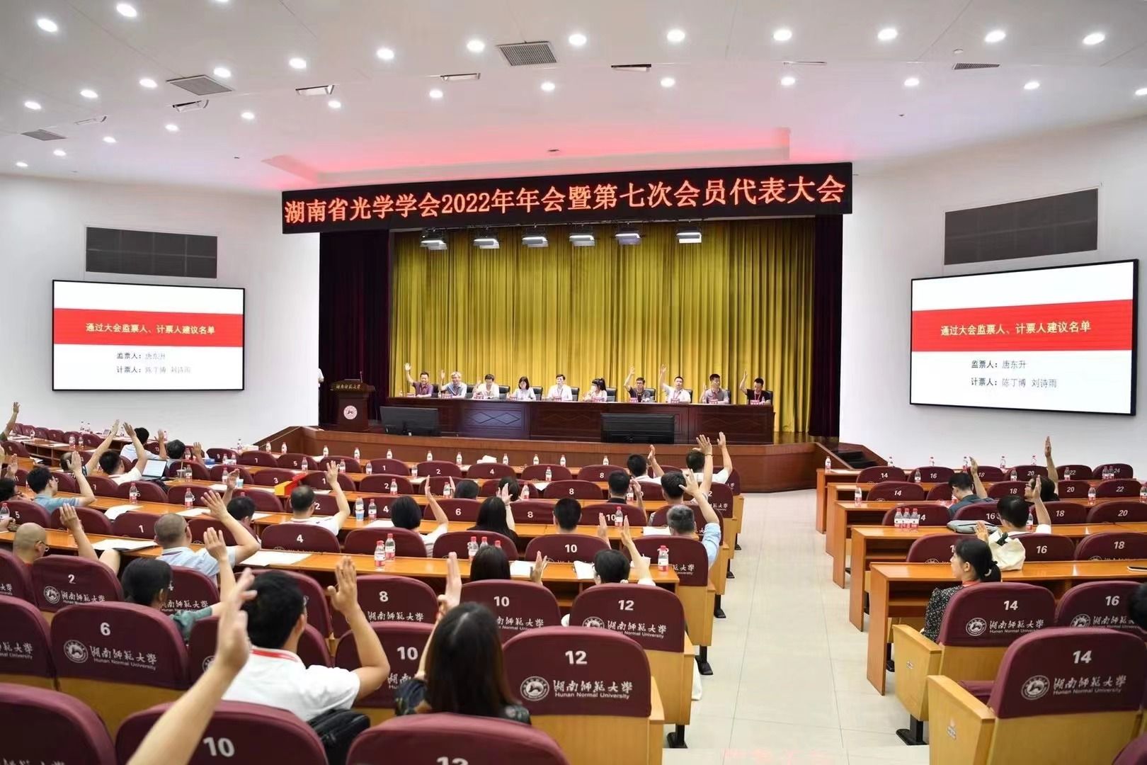 湖南省光学学会理事长、国防科学技术大学教授秦石乔在致辞中充分肯定我校澳门新新浦京708的建设与学科发展,同时对会务组精心的组织及志愿者细致周到的服务表示感谢!大会期间首先开展湖南省光学科技进展奖评选活动,并为获奖者颁发荣誉证书。然后召开第七次会员代表大会,听取审议第六届理事会工作报告和第六届理事会财务工作报告,通报了2018-2022年财务审计报告,通过了大会选举办法(草案),审议表决《湖南省光学学会章程(草案)》。最后换届选举产生了以国防科学技术大学罗晖教授为理事长的新一届理事会,我校澳门新新浦京708副院长廖洁桥教授新增为湖南省光学学会副理事长。湖南省科学技术协会党组成员、办公室主任马文胜,湖南省科学技术协会科学技术创新部副部长朱静颖和湖南省民政厅社会组织管理局科长李魅荻莅临指导。马文胜主任代表湖南省科协向大会的胜利召开表示热烈的祝贺!向全省光学专业领域的科技工作者致以诚挚的问候!李魅荻科长对学会上一届理事会的工作给予了充分肯定,希望新一届理事会再接再厉,祝愿学会发展蒸蒸日上!