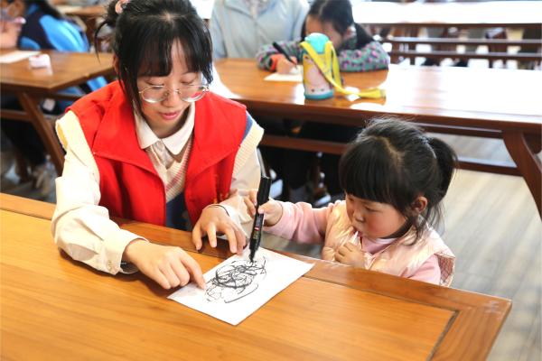 在讲解故事之前,魏馥忆带领小朋友们玩“击鼓传花”小游戏,接到“花”的小朋友需要上台进行自我介绍或者表演才艺,以此活跃课堂气氛。紧接着,魏馥忆开始讲解故事《十四只老鼠的蜻蜓池塘》,在讲述过程中,她通过提问的方式引导小朋友们积极参与,并对积极回答问题的小朋友予以零食奖励,由此提高小朋友们参与活动的热情。同时,魏馥忆呼吁小朋友们要多陪伴长辈,在日常生活中要注意饮食安全。在绘画环节,小朋友们发挥想象,在志愿者的帮助下,成功地画出了蜻蜓。