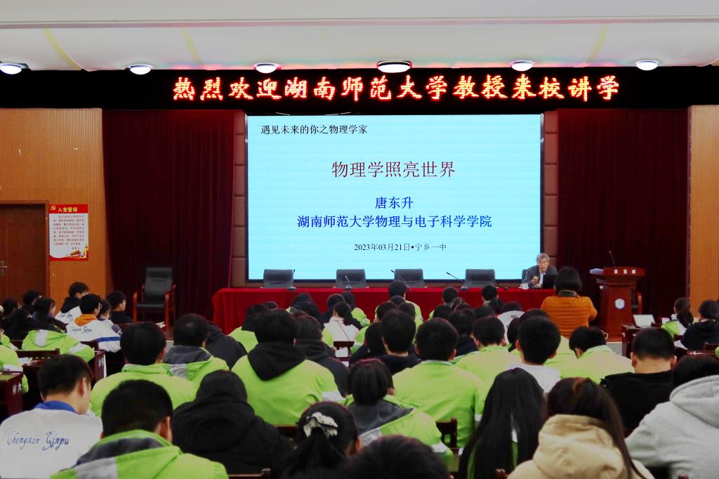 唐东升为宁乡一中学子做《物理学照亮世界》专题讲座。唐东升从“什么是物理学?”、“物理学家是什么样的人?”、“如何成为物理学家?”三个方面展开讲座,他结合物理学科中的经典实验、智能手机中蕴含的诺贝尔奖成果以及物理学家介绍等内容做出了深入浅出的阐述,引导广大中学生热爱科学、热爱物理,激发学生参与基础科学研究和科技创新的热情。同时,唐东升还为宁乡一中的学子们介绍了我校的历史沿革、学科建设、人才培养、学术成果等,鼓励同学们报考我校。