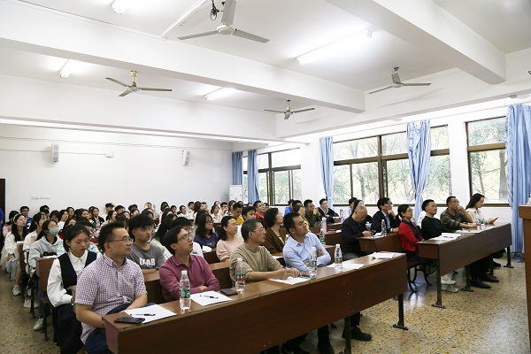2020级杜诗宇为参赛选手进行教学片段示范。物理系主任钟显辉教授进行点评,他对杜诗宇的教学方法、语言表达、课件使用等方面给予充分肯定,同时也指出其对时间把握不足并提出建议。