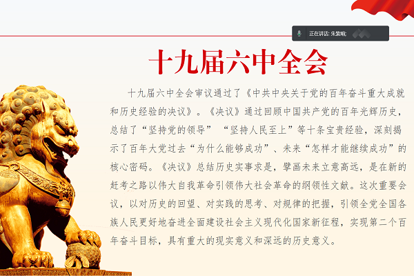 会议伊始,朱紫暄以“学习贯彻党的十九届六中全会精神”为题,让同学们感悟党领导人民取得的伟大成就。从站起来到富起来再到强起来,从“追跑”到“并跑”再到“领跑”,同学们了解到中国共产党过去为什么能够成功,今后怎样才能继续取得成功。参会人员观看十九届六中全会公报以及湖南省第十二次党代会报告,成员之间通过讨论交流、发言等多种形式深入学习领会。