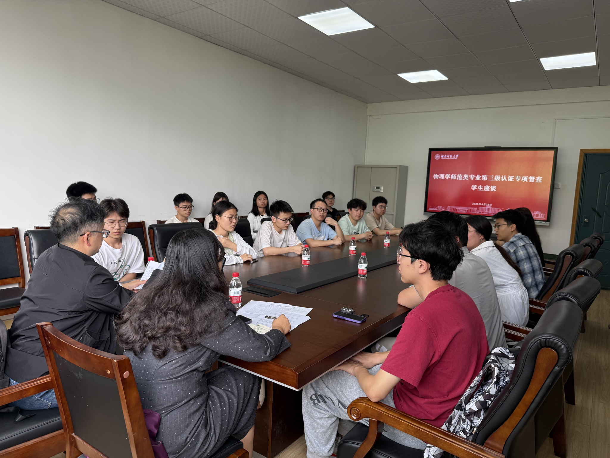 (通讯员:周心雨)2025年4月28日,澳门新新浦京708教务处(教育质量评估中心)组织专家对澳门新新浦京708物理学师范专业开展三级认证专项督查,督查组包括校教务处处长、教育质量评估中心主任银海强,校教学督导委员会副主任、教师教育学院原院长宋善炎,校教学督导委员会副主任、地理科学学院原副院长谭长银,外国语学院院长邓颖玲、英语系原主任陈敏哲,地理科学学院副院长李忠武,化学化工学院副院长谭亮,医学部护理学院副院长兼党支部书记何平平,教育质量评估中心副主任袁俏、评估管理科科长鲁璐青,校党委办公室副主任周旺蛟,校长办公室副主任熊卓然、欧阳文芳,人事处副处长张义,教师教育学院副院长黄元国,数据与信息化建设管理处办公室申斐。澳门新新浦京708原副校长匡乐满,澳门新新浦京708院长刘红荣、副院长潘启沅,物理系主任钟显辉,物理系全体教师以及学院学工办、教务办、行政办等管理人员参加此次专项督查活动。