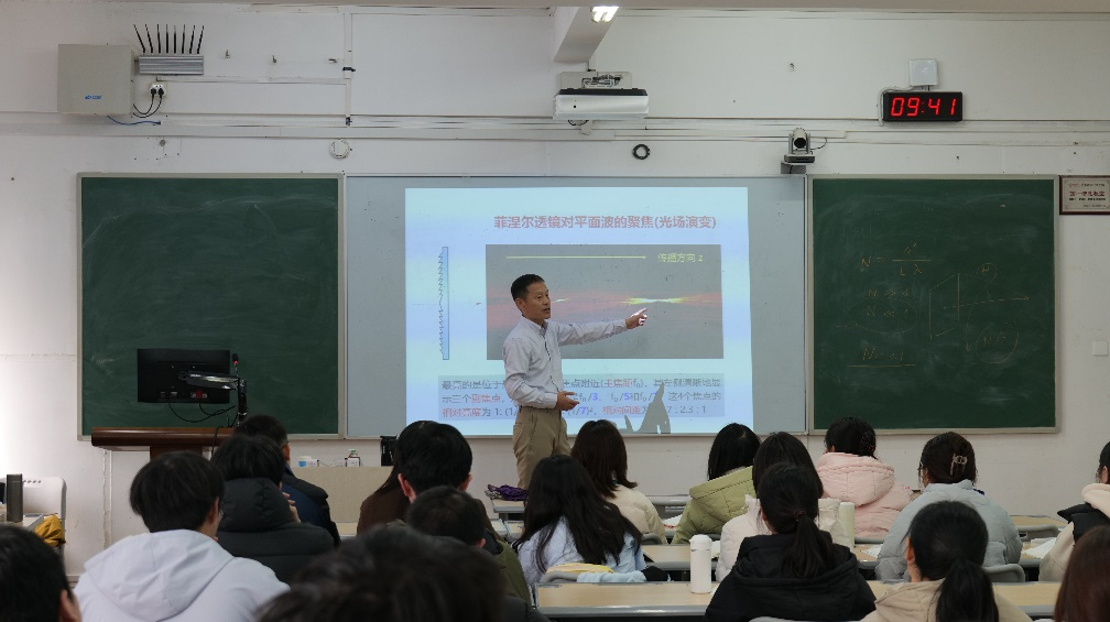 2025年11月18日上午,上海交通大学钱列加教授受邀来到我院,参加光学讲座和教学交流活动。授课环节由澳门新新浦京708刘红荣院长主持。钱教授以菲涅尔衍射为切入点,循序渐进地带领同学们深入探讨了圆孔衍射、泊松亮点和索墨菲边界波等光学现象。他不仅讲解了光学原理,还分享了抑制近场调制的实用方案,并深入探讨了菲涅尔透镜在现代技术中的应用前景。钱教授的讲解幽默风趣、深入浅出,课堂气氛轻松愉快,让同学们感受到了光学的无限魅力。全体光学课程组教师、物理系与电子系部分青年教师参与聆听学习。