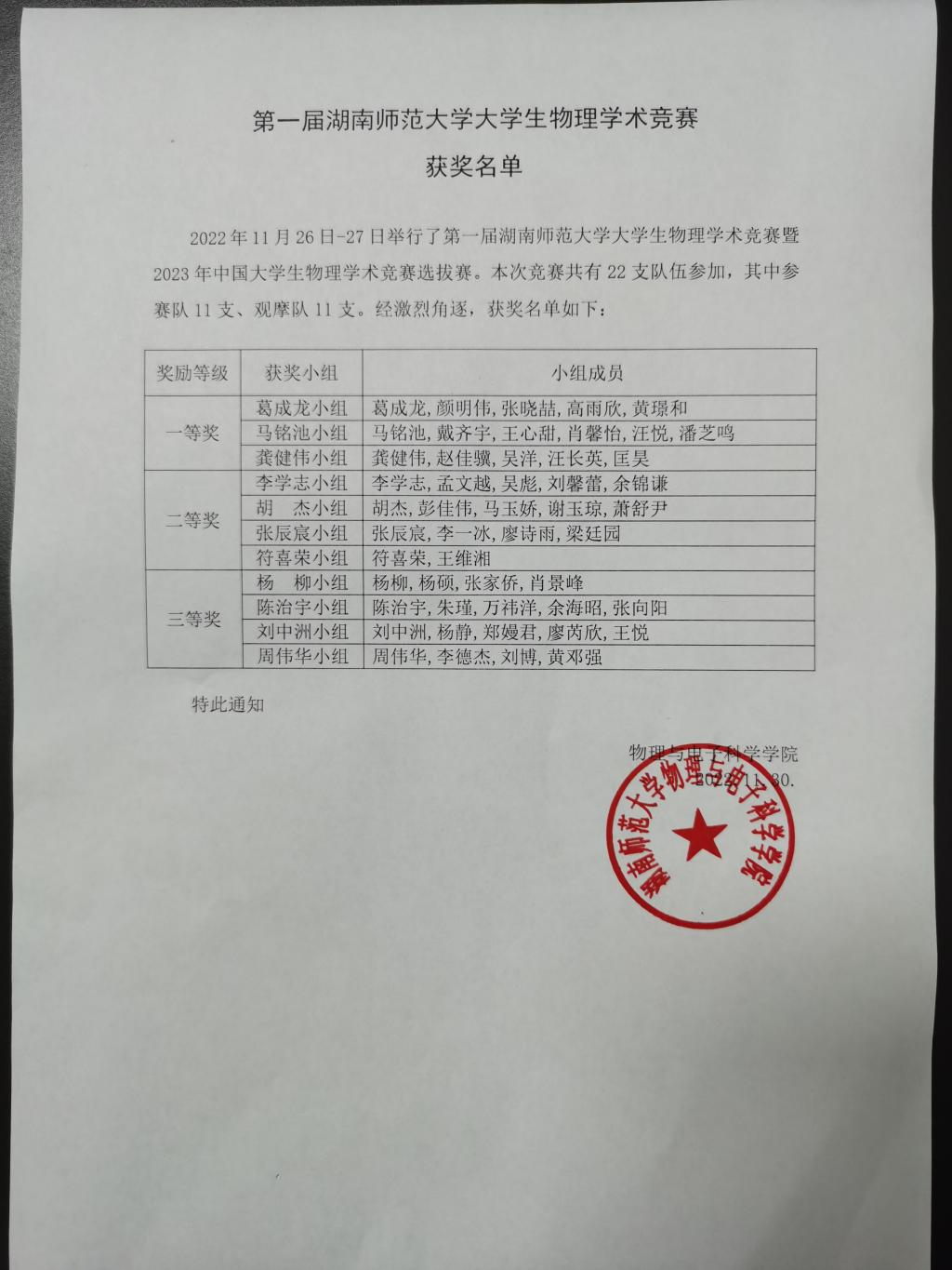 第一届澳门新新浦京708大学生物理学术竞赛获奖名单